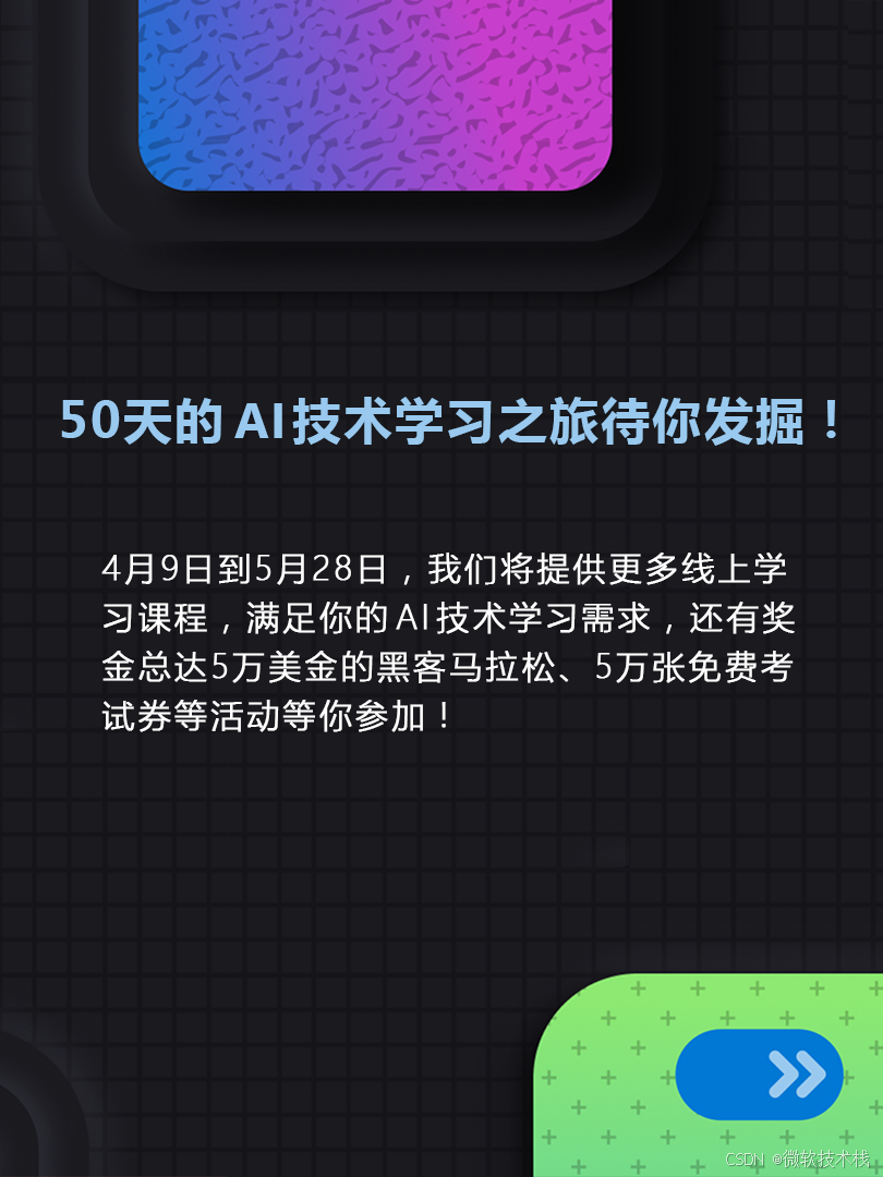 想提升你的AI应用技能吗?想尝试更具挑战性的最新智能体的自定义搭建吗?微软创想未来技能节,为你而来。4月8日-5月28日,我们邀请你一起展开连续50天AI技术探索之旅,参与丰富实用AI课程,掌握不同职能所需的AI 技能! 不管你是管理者,技术爱好者或是新手,总有一堂适合你!